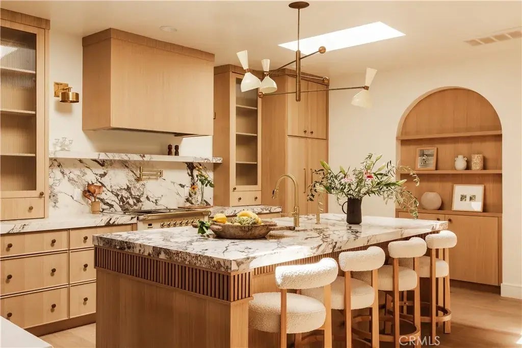 Welcome to The Kent House an absolute showstopper of mid-century modern design, meticulously renovated to perfection! This stunning 3-bed, 2-bath home spans 1209 square feet on a generous 4872 square foot lot, promising to be one of the most beautiful homes youll ever step foot in. The open-plan concept creates a seamless and inviting flow throughout, starting with a spacious living room featuring a beautifully refreshed fireplace with a porcelain hearth, setting a warm and welcoming ambiance. The heart of this home is the breathtaking kitchen, designed to impress with custom white oak cabinetry, a chic kitchen island illuminated by two skylights, and elegant porcelain backsplash and countertops a true culinary paradise for any home chef. Each bedroom is a sanctuary of comfort and style, thoughtfully designed with ceiling fans and exquisite light fixtures. The master bedroom is a private retreat, complete with a hidden en-suite bathroom for added luxury. The brand new bathrooms are elegantly appointed, showcasing modern design at its finest. This home is equipped with custom designed cabinets, high-end appliances, engineered flooring, and fresh paint inside and out, adding a touch of luxury and convenience to everyday living. Step outside and be amazed by the new deck and meticulously landscaped backyard, perfect for unforgettable family gatherings, BBQs, and outdoor entertaining. The expansive yard offers ample space for potential future expansions, including an in-progress ADU plan. The garage has been transformed with fresh paint, new lighting, and epoxy flooring, comp