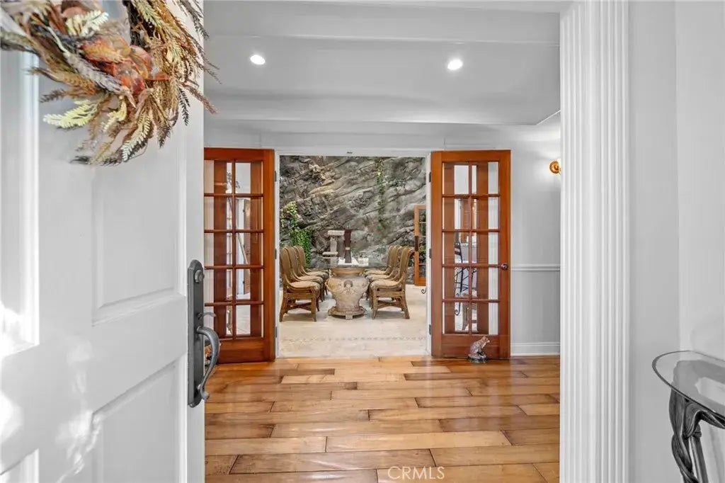 Tucked privately behind an expanse of greenery within the exclusive Bel Air Ridge community, this exceptional home offers a perfect blend of luxury, comfort, and convenience. Step inside to be greeted by your spacious atrium and dining area, its vaulted ceilings gleaming with natural light and complimented by a soothing custom waterfall. The adjacent space, currently utilized as a large office, makes for an ideal 3rd bedroom with its fireplace, French doors, and private patio. The kitchen opens directly to the dining room via bar-top and features Cambria quartz countertops, a ROHL sink, updated cabinetry, and stainless steel appliances. Step into the adjoining den with its built-in bar, custom wine rack, and direct access to the spacious yard, complete with pavers and shaded by trees. The main living room is an entertainer's dream having been upgraded to a home theater setup with integrated light and sound systems for the ultimate movie night experience. A powder room, laundry room, and direct access to the 2-car garage with built-in cabinetry and epoxy floors round out the downstairs area. Upstairs, the primary suite is a peaceful sanctuary with high ceilings, en-suite bath with dual vanities and soaking tub, a walk-in closet, and a private balcony with tranquil arboreal views. The ample second bedroom features direct access to a second full bath, ensuring privacy and comfort for family or guests. Bel Air Ridge offers a truly resort-style lifestyle with an array of amenities including 2 pools, a spa, 6 tennis courts, pickleball/basketball courts, racquetball court, a recre
