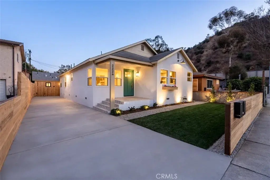 Nestled in the vibrant Frogtown neighborhood of Los Angeles, this newly remodeled property is a true gem, offering a blend of modern luxury and functional living. Located just steps from the revitalized Los Angeles Riverwalk and within walking distance to local coffee shops and dining, this home is perfect for those seeking style and convenience. The property includes a beautifully renovated main house and a fully remodeled ADU (Accessory Dwelling Unit), both sharing a spacious, private backyard ideal for outdoor entertaining. Inside the main home, you'll find an open floor plan that seamlessly connects the living, dining, and kitchen areas. The kitchen features taupe inset shaker cabinets, an oak island with a Taj Mahal quartzite waterfall edge, and a striking counter-to-ceiling backsplash. Down the arched hallway, a remodeled full bath boasts fluted oak tiles and brass fixtures. Two spacious secondary bedrooms, one with a half bath, are located further down the hall. The primary bedroom is a sanctuary, with a walk-in closet and a luxurious en suite bath with terrazzo floors, two-tone tile, and brass accents. One of the standout features is a hidden bookshelf door that leads to a fully remodeled speakeasy-style basement, ideal for intimate gatherings, while additional storage space or a wine cellar is tucked behind a secondary door. Throughout the main home, new oak LVP flooring and windows enhance both style and function. The one bedroom ADU, with its own private patio, offers a sleek kitchen with oak shaker cabinets and matte black hardware. The bathroom features fluted