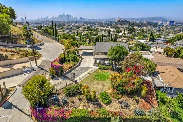 Welcome to this unique hilltop home with stunning panoramic views of Downtown LA, the Hollywood sign, Dodger Stadium, and the San Gabriel Mountains. This property lends itself to buyers seeking the ideal multigenerational or income-producing home. There is a primary house spanning 1210 square feet (approximately) and features two bedrooms, one bathroom, and a separate office/den along with an attached newly constructed, fully permitted, 560-square-foot (approximately) one-bedroom Accessory Dwelling Unit (ADU) with a private yard. The homes are on an expansive 13,036 square-foot double lot, surrounded by mature landscaping and numerous fruit trees. The potential to build an additional ADU on this double lot further enhances buyers' options for the future. The gated driveway offers plenty of parking. This retreat is only minutes from downtown's vibrant social, entertainment, and dining scenes, USC Medical Center, Keck Hospital, and Cal State University LA. Video Tour - https://player.vimeo.com/video/1005844773?badge=0