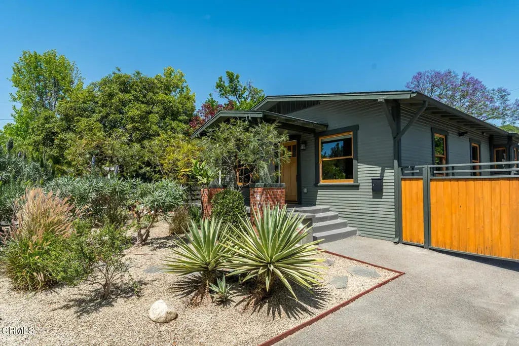 Pristine Modern Craftsman on a quiet tree-lined street near Occidental College. This captivating gem was extensively remodeled and expanded in 2018 to its contemporary style with beautiful hardwood floors, dual pane windows, abundant natural light, recessed lighting, clean lines, and an open floor plan. The drought-tolerant landscaping and covered front porch provide great curb appeal and invite you to step inside, where you're sure to admire the lovely flow from the living room to the dining area to the kitchen. The light-filled space opens to the back deck and backyard, making entertaining a breeze. The kitchen features natural birch flat panel cabinetry, stunning stone counters with seating, and newer Samsung & Kitchen Aid appliances. Two bedrooms and a laundry area lie to the north of the common area and share an eye-catching bath that complements the modern aesthetic. Beyond is the primary en-suite that could be your own private oasis. There's a generous walk-in closet, attractive matching bath with glass-enclosed shower, and a large bedroom with vaulted ceiling and French doors to another deck and the grassy backyard. Foliage and fencing surround the backyard, providing a serene space for parties and play. Enjoy the shade from a towering jacaranda tree as you entertain or simply relax with a glass of lemonade. Steps away is the converted garage with heat & air, that affords lots of possibilities as an office, studio, or guest quarters. This beautiful turnkey home is close to trendy Eagle Rock shops & restaurants, Fiji Hill Hiking Trail, and all that Occidental College