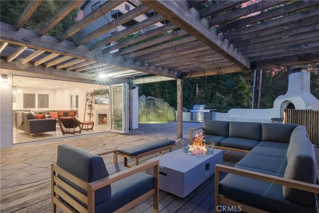 Discover unimaginable peace, tranquility, privacy and sophistication in this stunning Hollywood Hills retreat, exquisitely renovated in 2020 to offer the perfect escape from the hustle & bustle of LA city life. Perched high above iconic Mulholland Drive, this serene home is enveloped by nature, providing the privacy and peacefulness of a modern wooded country retreat. The home features a cozy two-bedroom, two-bath design with a detached modern home office/gym. Gourmet kitchen with high end appliances including Viking fridge & Viking cooktop purchased in 2023, porcelain countertops, dimmable interior cabinet lighting, built-in stainless-steel oven and microwave, all of which opens to a living room which includes a wood burning fireplace along with breathtaking canyon views. Step into the spa-like primary bathroom modern oasis designed as the ultimate retreat for relaxation and rejuvenation. The striking chevron-patterned wall tile creates a visually captivating focal point, enhancing the bathrooms contemporary appeal. You will fall in love with how the primary bathroom transforms into a serene and calming sanctuary. Other features include ceramic tile, Gerberit wall-hung toilets, custom frameless showers, Hansgrohe faucets, and copper plumbing with a hot water recirculation loop for immediate hot water. Enjoy seamless indoor-outdoor living with a large, expansive terrace and built-in jacuzzi perfect for outdoor dining and entertaining. Nestled at the end of a long & dramatic gated driveway with sweeping treetop views, offering both seclusion and convenience to Hollywood, the