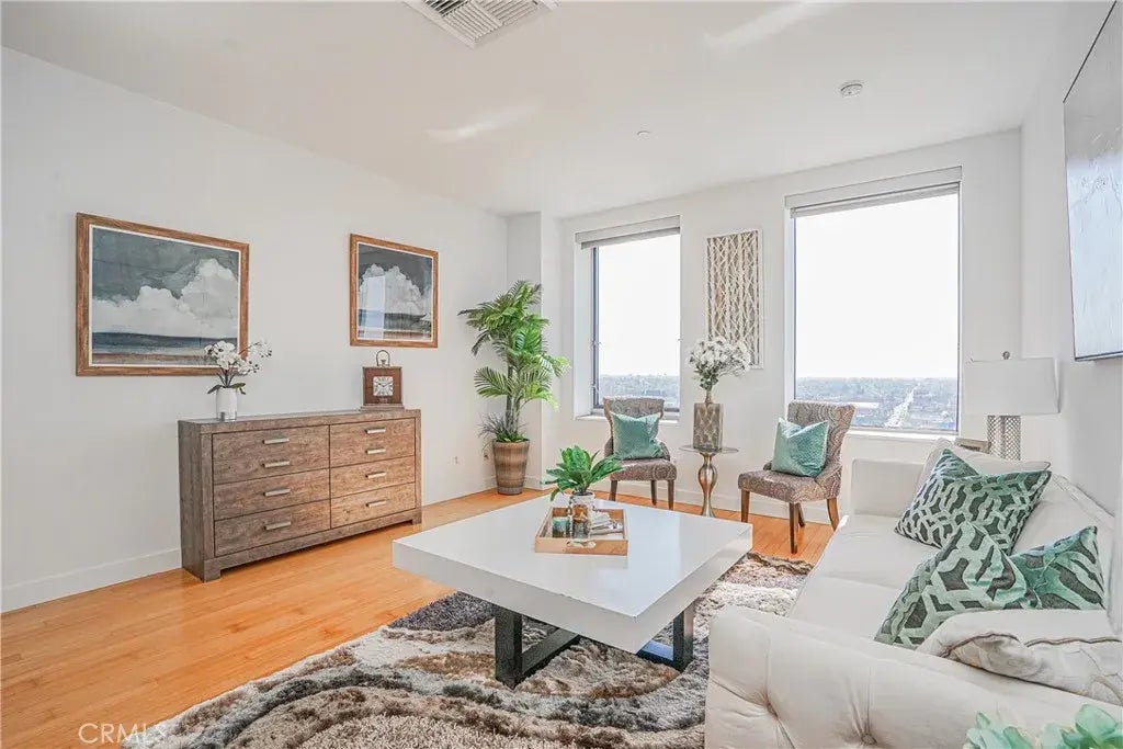 Experience modern urban living at The Mercury, located in the heart of Los Angeles. This luxury loft-style condo offers the perfect opportunity for those seeking a stylish live/work space ideal for professionals or small business owners looking to combine home and office in one sophisticated setting. The open loft layout features wood flooring throughout, soaring high ceilings, and a stunning south-facing view of the iconic LA skyline. The spacious closet and full bathroom with a tub, ample storage, and a large mirrored medicine cabinet add both function and convenience. Enjoy resort-style amenities including concierge service, a rooftop pool, BBQ area, and fitness center, all with breathtaking city views. Perfectly situated across from the Metro station and near the Financial District, this location offers unbeatable convenience with endless dining, shopping, and entertainment options all within walking distance. Be creative this home office concept could be your next smart investment and a cost-saving solution in one of LAs most vibrant neighborhoods.