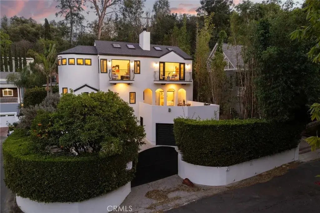 Tucked away in the Hollywood Hills at the end of a quiet cul-de-sac, this enchanting 1920s gated compound has been fully updated, blending timeless charm with modern comforts. Boasting picturesque views of the surrounding hills and mountains, this private retreat is a true sanctuary designed by a sexy architect in one of Los Angeles' most coveted neighborhoods. Enter into a dramatic foyer where a grand two-story spiraling staircase serves as the centerpiece of the homes refined architectural design. The main level features a spacious formal dining room and remodeled kitchen equipped with high-end stainless steel appliances. There are two bedrooms and two bathrooms on this level, both of which have french doors that lead out to large patios. On the upper-level, a sun-drenched living room and luxurious primary suite are both highlighted by soaring vaulted ceilings with skylights and french doors that open to private balconies. The primary suite also offers a walk-in closet and spa-inspired ensuite bathroom with a jetted tub, large shower and double vanity. A secondary bedroom and bathroom complete the upper level. Additional amenities include high ceilings throughout, a security system and two oversized one-car garages, one of which has a laundry area. Secluded behind private gates and surrounded by mature privacy hedges, the front yard features a lush garden area and convenient parking for two additional vehicles. Centrally located in the Hills between the Hollywood Bowl and Universal, this property is only moments away from Ventura Boulevard's vibrant shopping and dining sc